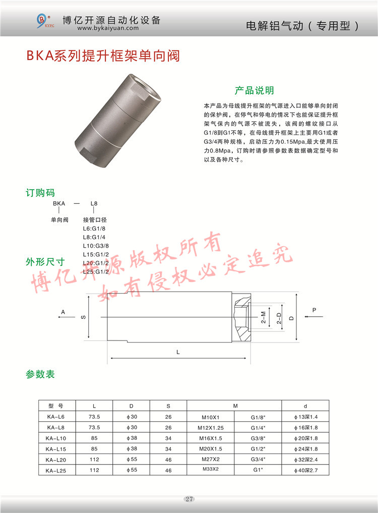 型號BKA-L20和BKA-L25的氣動單向閥,由博億開源公司自主研發(fā),主要用于電解鋁行業(yè)母線提升框架的儲氣裝置,更多的技術(shù)咨詢請聯(lián)系本公司技術(shù)部:0371-85612788。