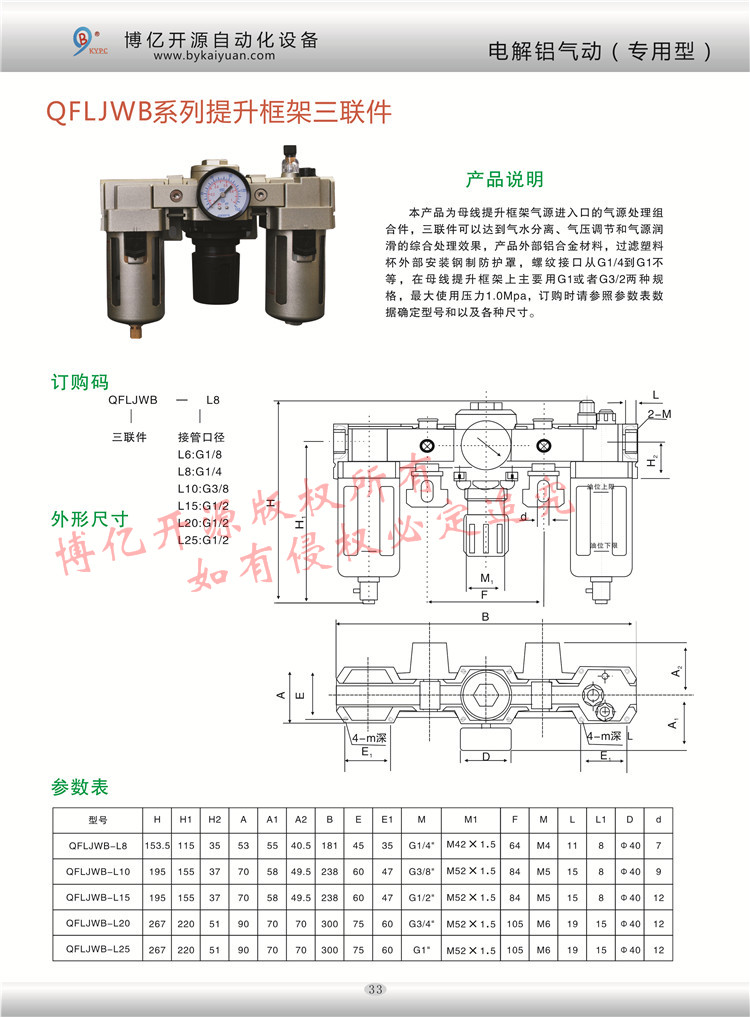QFLJWB氣源處理三聯(lián)件接口口徑從G1/2至G1寸的內(nèi)螺紋連接,QFLJWB-15主要用于母線提升框架氣源進(jìn)入口,更多的技術(shù)咨詢請(qǐng)聯(lián)系本公司技術(shù)部:0371-85612788。
