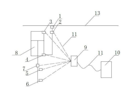如圖所示,本新型電解槽用智能打殼氣缸包括設(shè)置在電解槽加料口上方的活塞桿端連接有打殼錘頭7的打殼氣缸8,打殼氣缸的兩個(gè)進(jìn)出氣口通過管路分別與兩位五通電磁閥2的相應(yīng)接口相連,兩位五通電磁閥2通過減壓閥1與壓縮空氣總管13相連接;在打殼氣缸的兩個(gè)進(jìn)出氣口處分別設(shè)置有壓力傳感器3、4,在打殼錘頭伸縮運(yùn)動(dòng)的上、下行程止點(diǎn)處分別設(shè)置有限位開關(guān)5、6 ;壓力傳感器、限位開關(guān)、減壓閥以及兩位五通電磁閥的控制接口均通過連接電纜11與PLC控制器的相應(yīng)接口連接,PLC控制器通過連接電纜11與槽控機(jī)通訊連接。