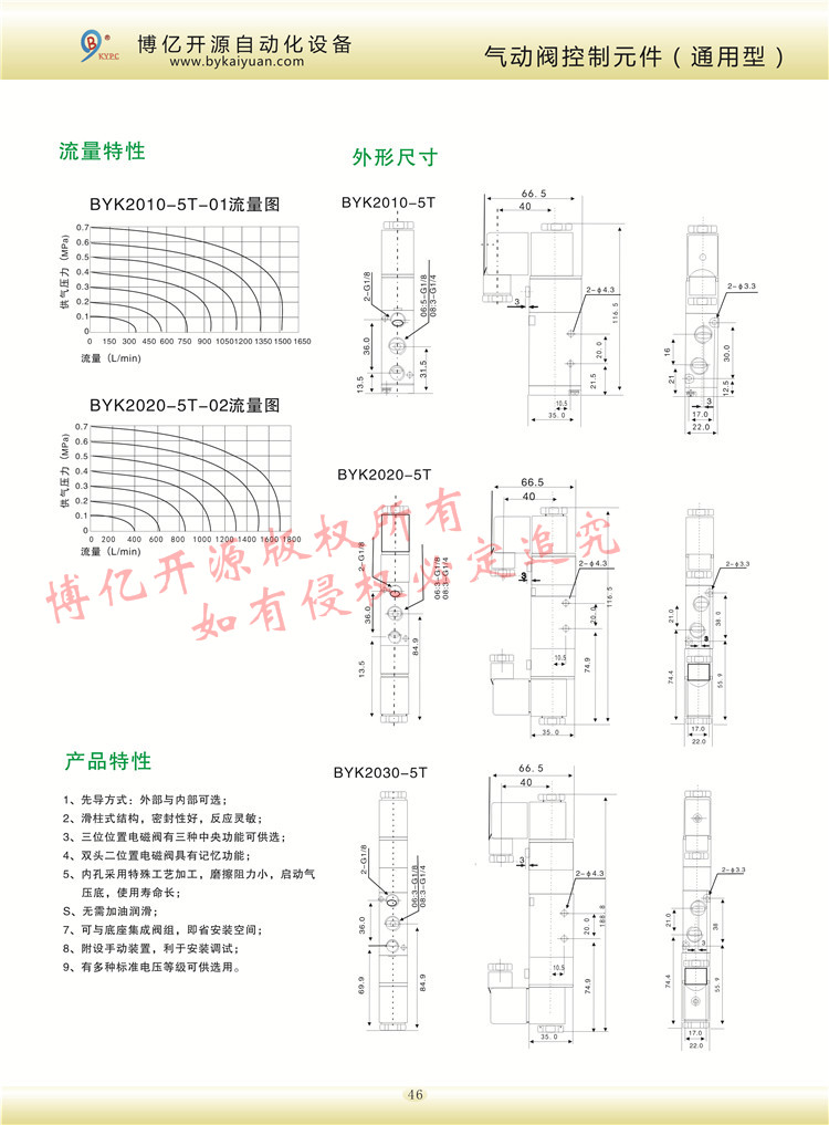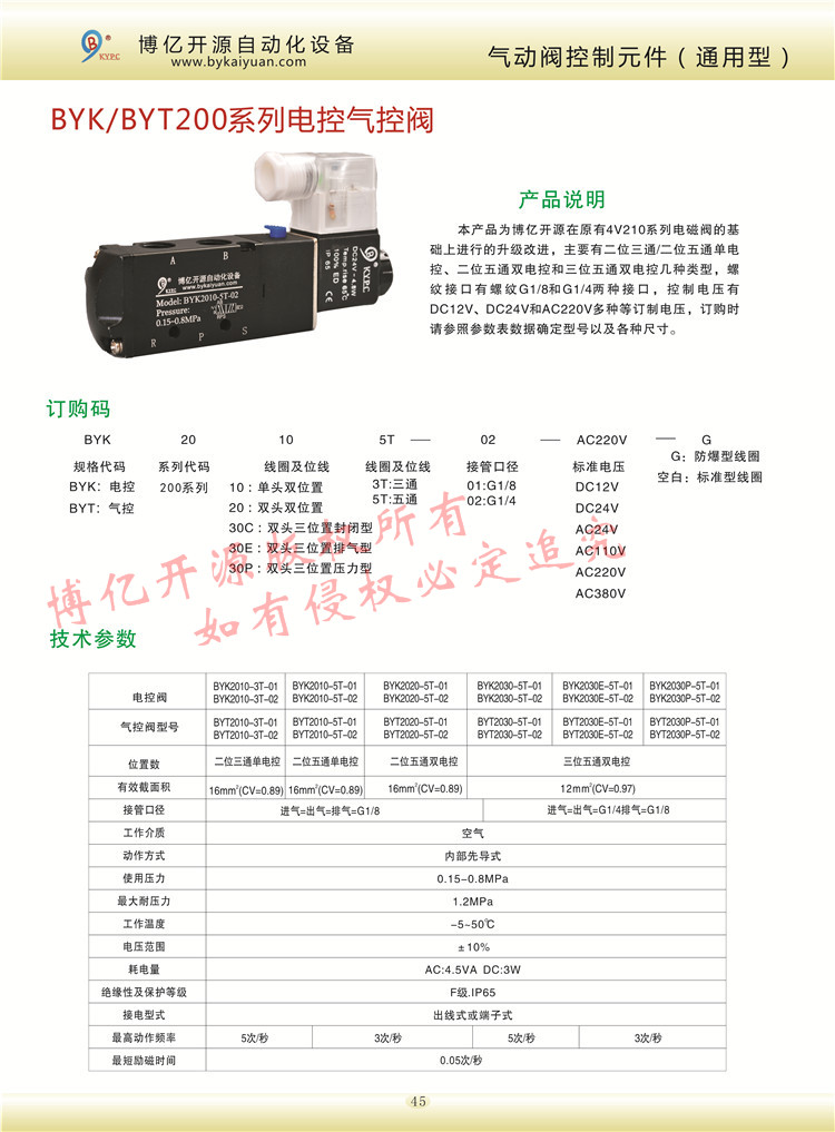 BYK/BYT200系列電控氣控型號有一分接口和二分接口的二位三通、二位五通、三位五通單電控,雙電控的各種電壓控制,更多的技術(shù)咨詢請聯(lián)系本公司技術(shù)部:0371-85612788。